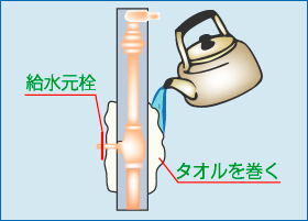 ③人肌程度(30~40℃)のぬるま湯を給水元栓に巻いたタオルにゆっくりかける。