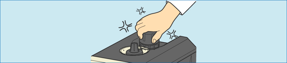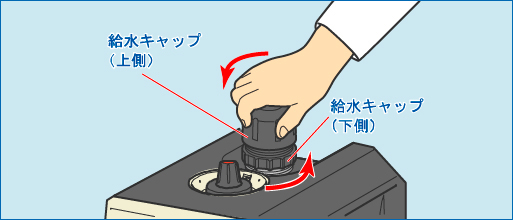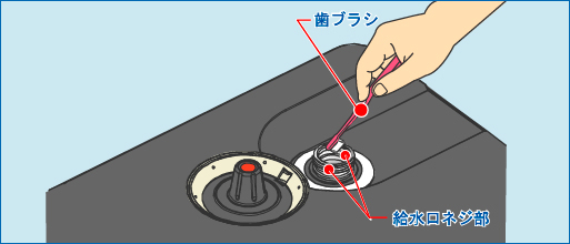 上記のグリスアップを行なっても給水キャップの開閉が固い場合は、給水口ネジ部の清掃を行なってください。給水口ネジ部の清掃は、ハブラシや布を使用してください。清掃の際は、ハブラシや布をタンク内部に落とさないように十分注意してください。