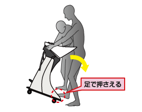 - 本体カバーの先端を足でおさえて、ボウルを持ち、本体を自分の体の方へ引き寄せるように倒します。