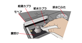 - 給湯・給水カプラ、排水口ふた、露受け内及びモヘアについている髪の毛や水を拭き取り、清掃してください。