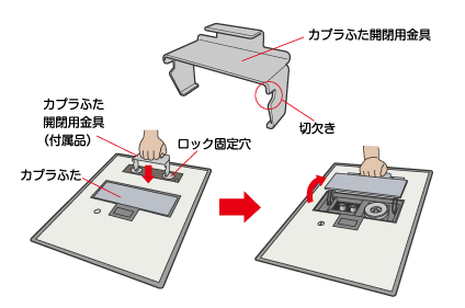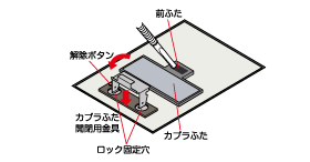 下部ユニットのロック固定穴にカプラふた開閉用金具(付属品)を装着し、ゆっくり下に押してカプラふたをあけます。