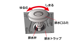 排水口ふたを左(反時計方法)に回し、排水弁を取り外して、排水トラップ内のゴミなどを取り除いてください。