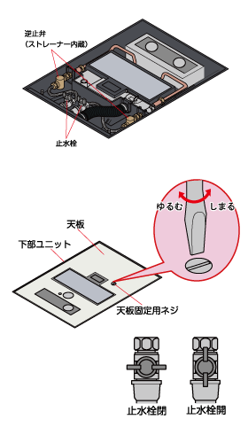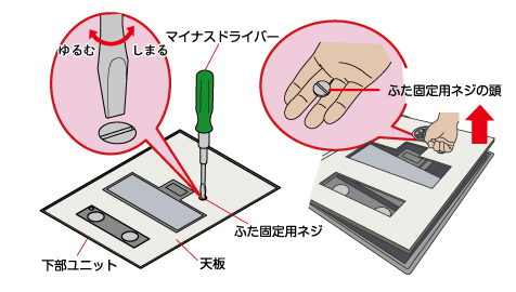 - 1. 下部ユニットの天板固定ネジをマイナスドライバーなどで回し、天板を開けてください。